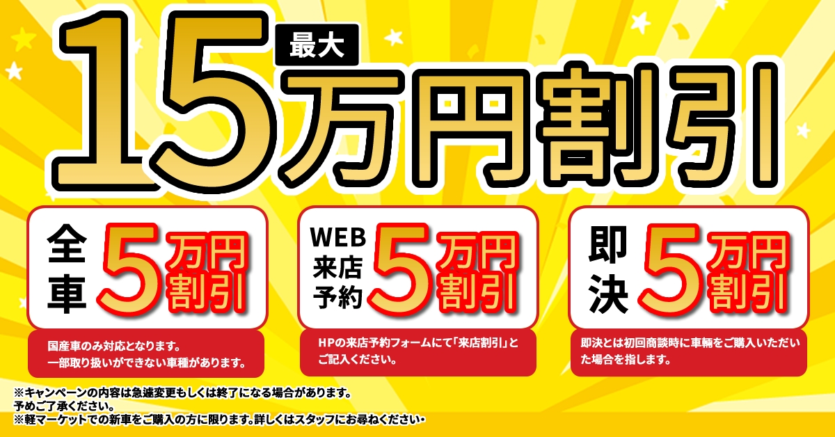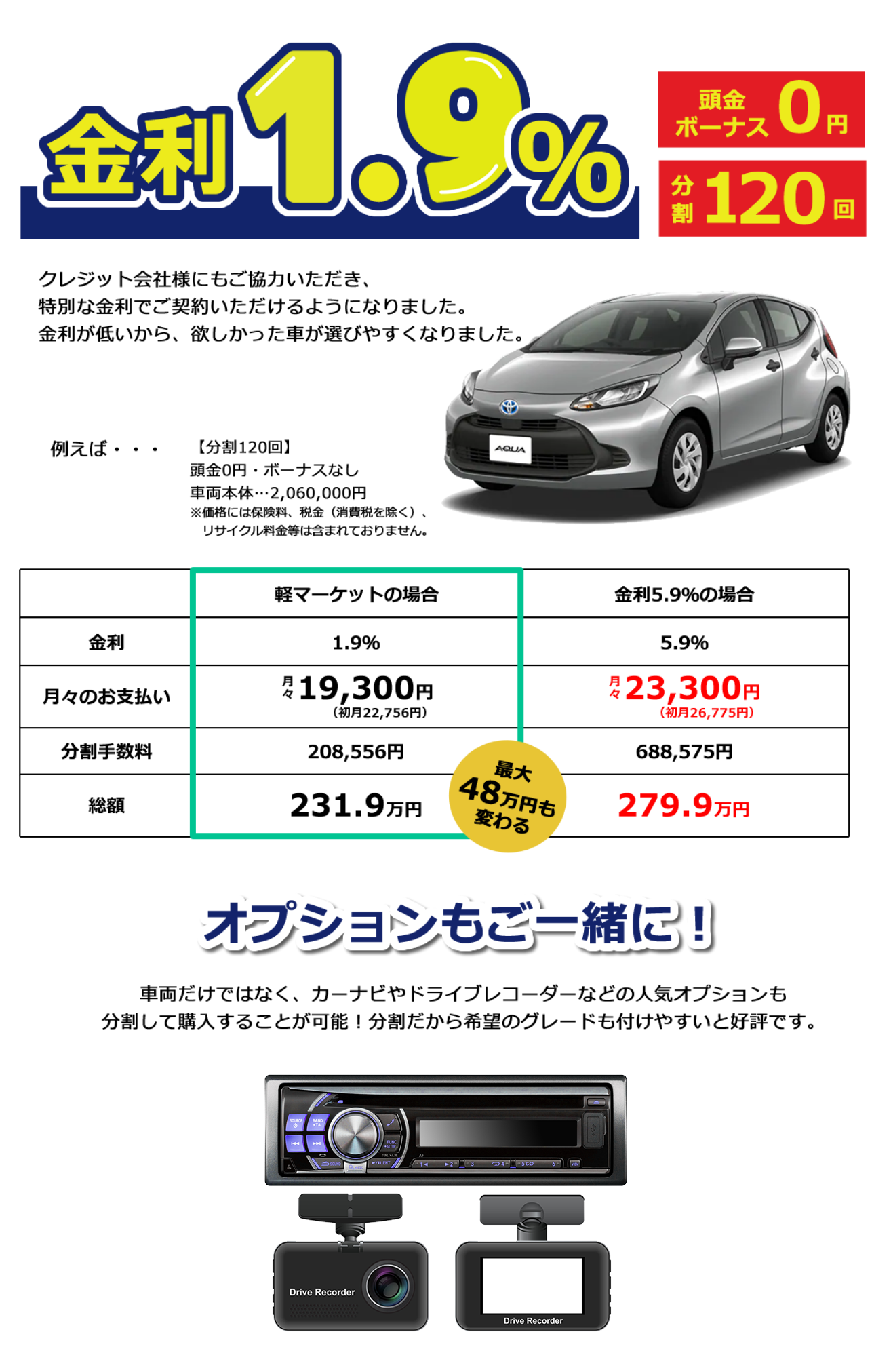なぜ、他店よりも安く新車が買えるのですか?- 自動車を分割で購入する際には必ず金利が発生します※1。Kマーケットは、ローンの金利が1.9%と低いので、 新車本体価格は同じでも、支払い総額に差が出てくるのです。 分割時の金利手数料を抑えることで、あこがれの車や1ランク上のグレード、欲しかったオプションも無理なく 付けることができます。軽マーケット、皆様の「新車に乗りたい」を応援します。 ※1オートローン、マイカーリース、残価設定型クレジットなど